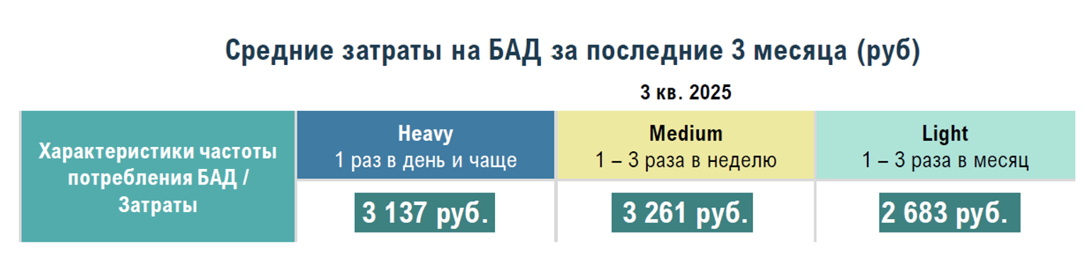 Согласно свежим данным исследования Ипсос Комкон (2025), сильнее всего потребление БАД растёт среди постоянных пользователей: доля людей, принимающих добавки один раз в день и чаще, увеличивается, а за последние три месяца средние затраты на БАДы у активных потребителей превышали 3 000 рублей.
