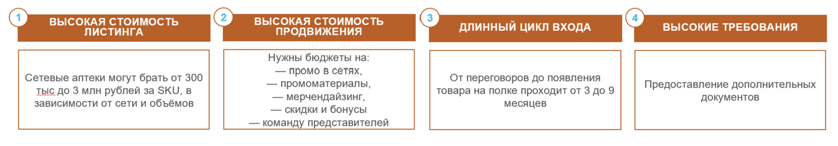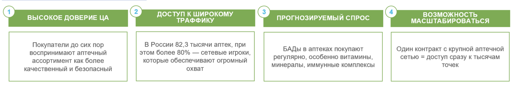 Аптеки — это канал, который требует наибольших инвестиций и времени на запуск, но взамен даёт бренду стабильный оборот и доступ к массовой аудитории. Это не про быстрые продажи, а про закрепление на рынке и долгую игру.