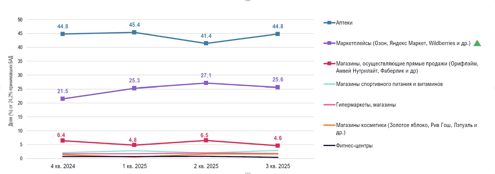 При этом аптеки остаются самым популярным местом покупки (около 45 % потребителей), в то время как маркетплейсы занимают более четверти всех покупок БАДов, значительно опережая другие офлайн-каналы.